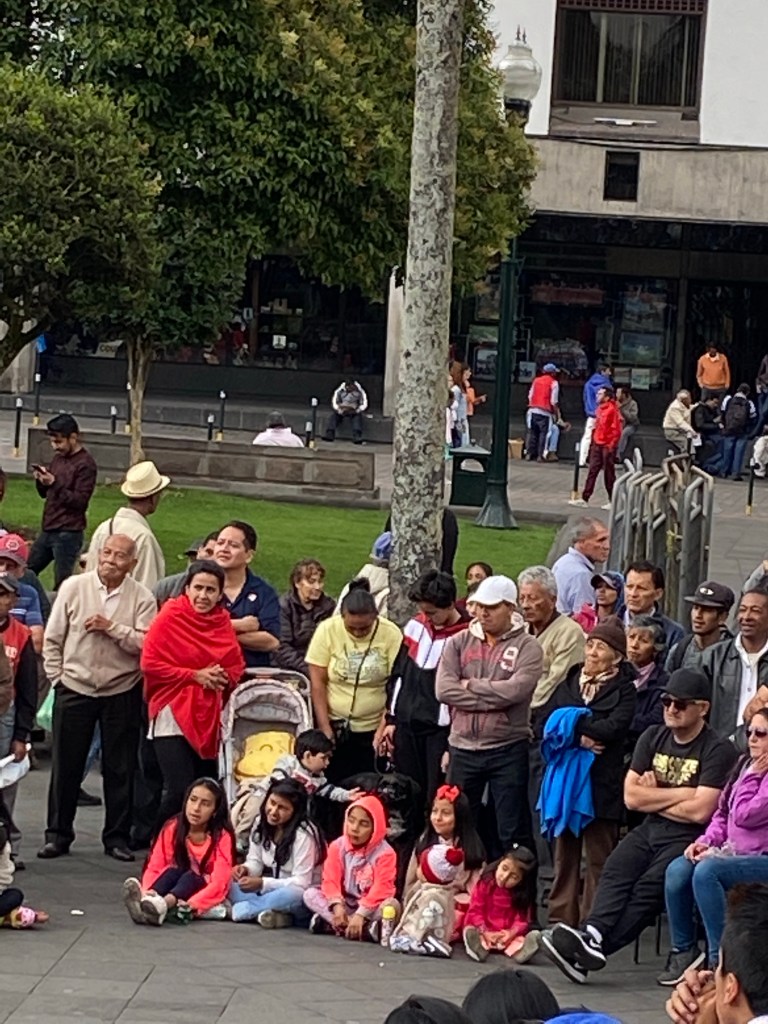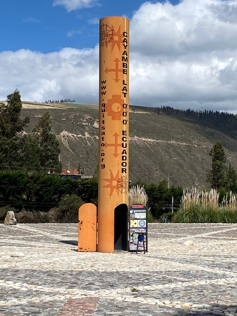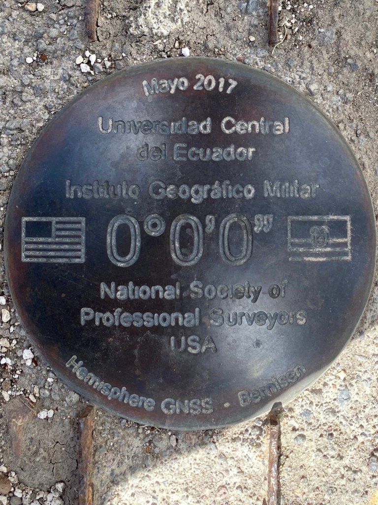 Selling cold drinks to people driving by. People watching street performers in the plaza. Another shot of people watching street performers. Stopped at latitude 0.000 (equator) on our drive from Otavalo to Quito today. Surveyors mark at the equator. Not sure why we are including this shot. Gene climbed to a viewing site at the equator.