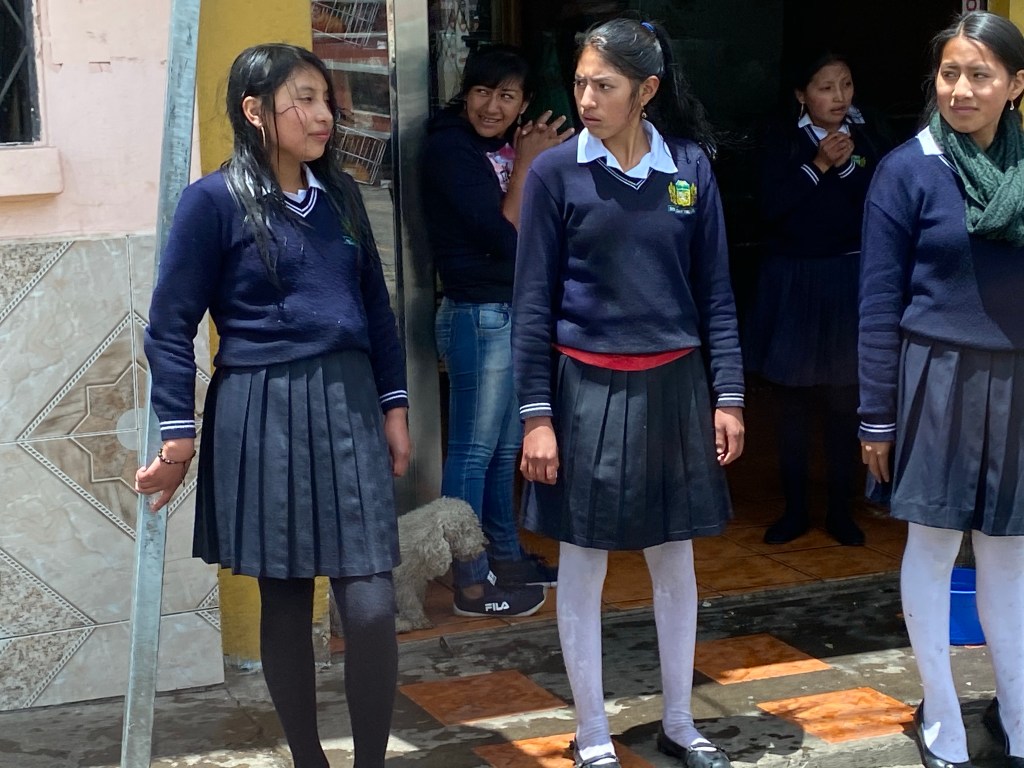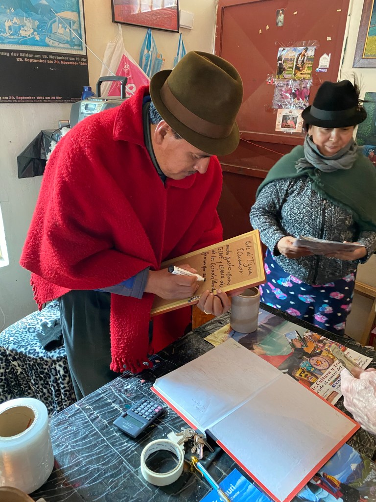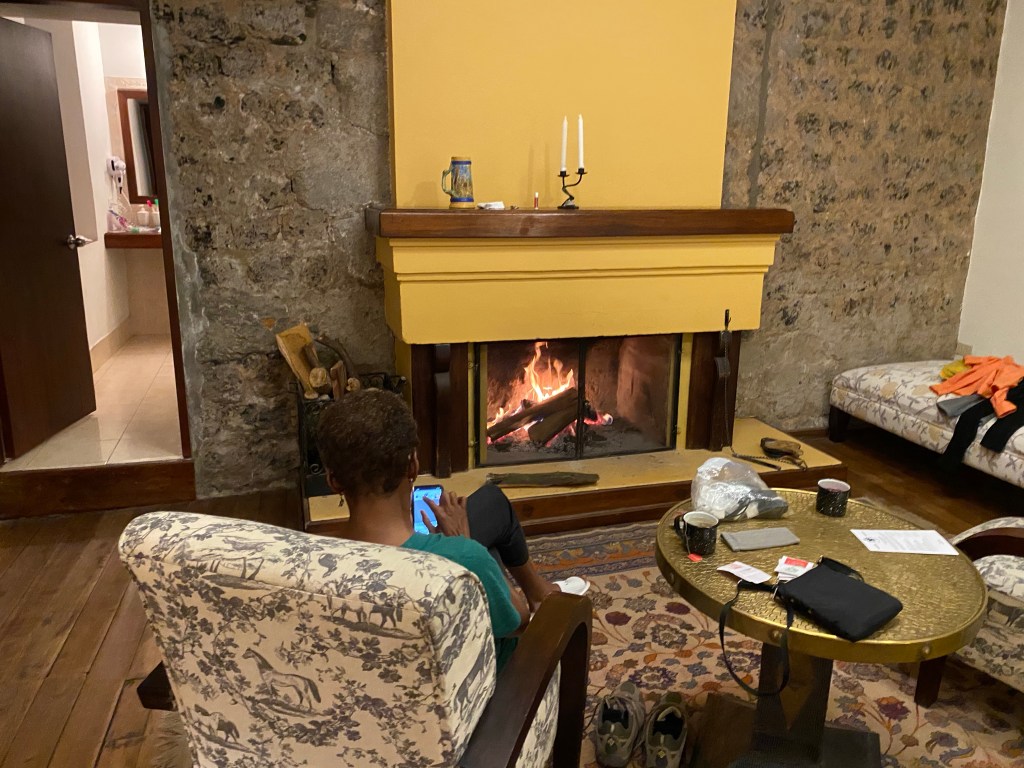 Bought a cool painting for the kitchen. This is the artist signing for us. Tuesday market. Our room for tonight and tomorrow. 17th century hacienda. Having tea in front of the fireplace after dinner. Scene from the highway. Country living. Folks are pretty poor out here. Poor soil, steep slopes, rocks and little water makes farming difficult. Ladies are wet! Some sort of games going on the past few days where kids are throwing water balloons at each other.