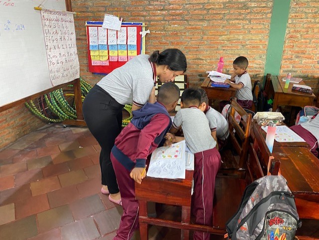 Teacher Silvia supporting young learners. Notice that Silvia is barefooted. No shoes in the classrooms.