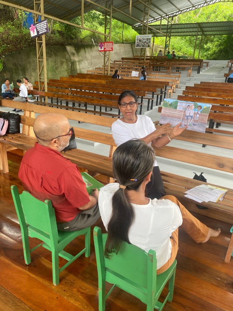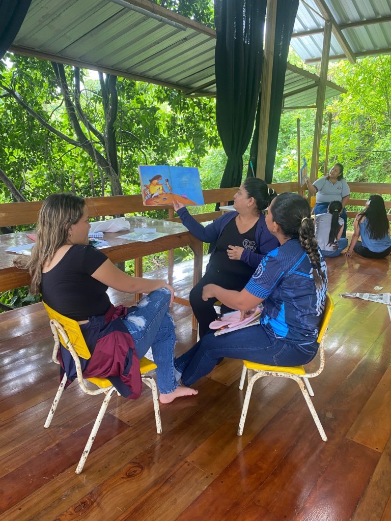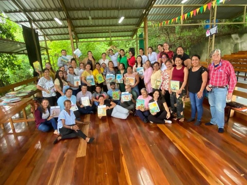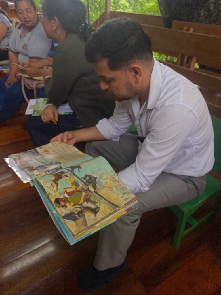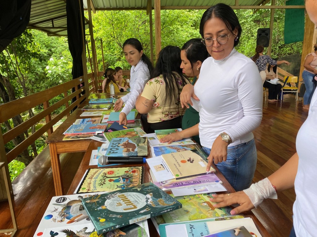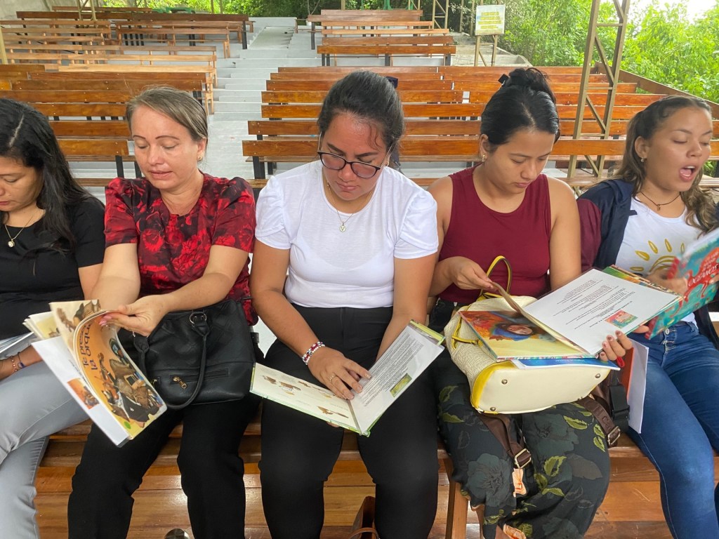 The workshop is being hosted by the Sathya Sai School in Bahia de Caraquez, Ecuador. Other local schools have been invited and are participating. A total of 42 teachers are attending. As you will see, the pictures below reflect the high interest and enthusiasm of the teachers as they explore the collection of fiction and non-fiction children’s books. Exploring and teaching with children’s books is a new experience for the teachers since they lack easy access to children’s books in their schools and communities.